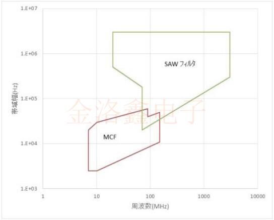 水平軸是標(biāo)稱頻率,垂直軸是通帶寬度,表明與SAW濾波器相比,MCF的可制造范圍是低頻/窄帶.