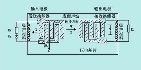 這種濾波器的基片是由壓電材料(如鈮酸鋰或石英晶體)制成,在基片上蒸鍍兩組“叉指電極”,一般由金屬薄膜用光刻工藝刻成。左側(cè)接信號源的一組稱為發(fā)送換能器,右側(cè)接負(fù)載的一組稱為接收換能器,圖中a、b分別為電極寬度和極間距離,W為相鄰叉指對的重疊長度,稱為“叉指孔徑”。當(dāng)交變的電信號us加到發(fā)送換能器的兩個電極上時,通過反壓電效應(yīng),基片材料就會產(chǎn)生彈性形變,這個隨信號變化的彈性波,即“聲表面波”,它將沿著垂直于電極軸向(圖中x方向)向兩個方向傳播,一個方向的聲表面波被左側(cè)的吸聲材料吸收,另一方向的聲表面波則傳送到接收換能器,由正壓電效應(yīng)產(chǎn)生了電信號,再送到負(fù)載RL。但叉指換能器的形狀不同時,濾波器對不同頻率信號的傳送與衰減能力就會不一樣。