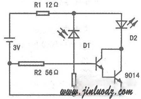 下圖的電路非常簡(jiǎn)潔,2只NPN三極管組成復(fù)合管用于放大被測(cè)的遙控器紅外光信號(hào),D1用扁平紅外線(xiàn)光敏二極管,D2用紅色圓型發(fā)光二極管,Rl為D2限流電阻,R2為遙控器上IC輸出限流電阻,R3與Dl組成分壓電路目的是泄掉Dl的反向穿透電流。如沒(méi)有R3,D2將長(zhǎng)亮。電阻可使用1/8W的。